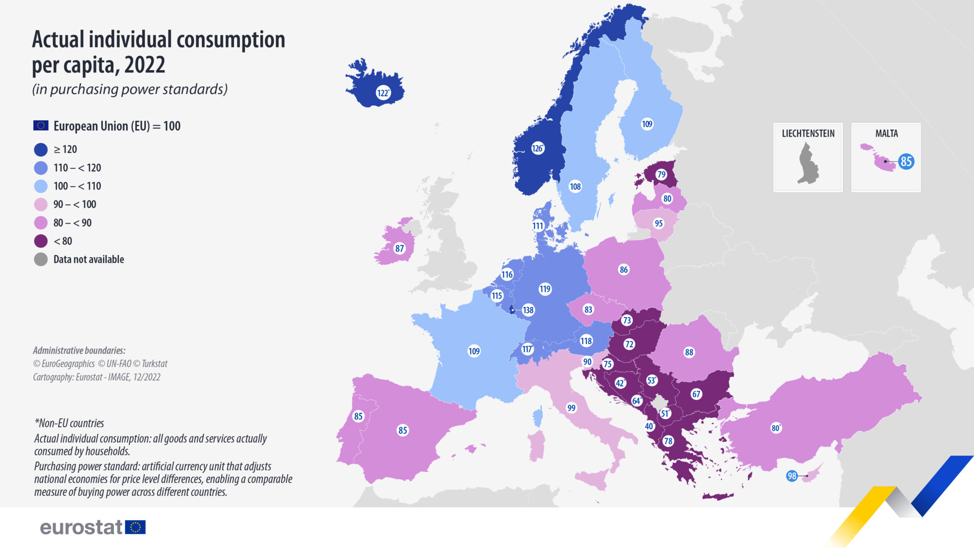 Skutočná individuálna spotreba na Slovensku, vyjadrená v parite kúpnej sily, bola v roku 2022 na 73 percentách európskeho priemeru. Ide o spotrebu tovarov a služieb v domácnostiach bez ohľadu na to, či za ne platili priamo, financovali ich verejné rozpočty alebo mimovládne organizácie.