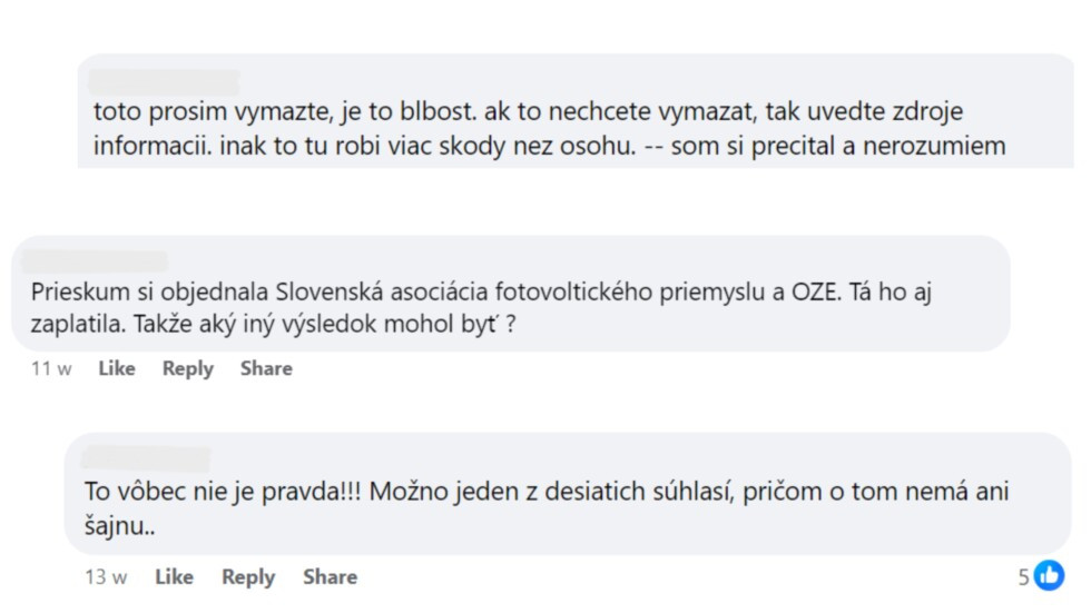 Spochybňovali aj prieskum, podľa ktorého za významnejšie využívanie veterných elektrární je až 77 percent Slovákov. Zadávateľom bola Slovenská asociácia fotovoltického priemyslu a obnoviteľných zdrojov energie (SAPI), niektoré profily preto usudzujú, že výsledky nemohli dopadnúť inak ako v prospech zelených zdrojov.
