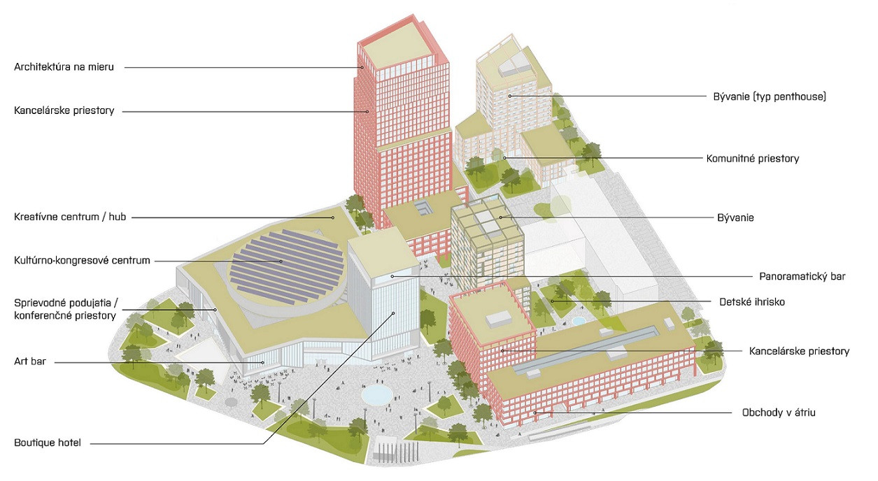 Dominantou bude kultúrno-kongresové centrum, ktoré má byť schopné hostiť aj veľké zahraničné podujatia. Okrem neho sú v projekte zakreslené aj dve rezidenčné budovy, tri administratívne a kongresový hotel. Architektonickú súťaž vyhrala holandská kancelária KCAP spolupracujúca s nemeckým ateliérom Cityförster.