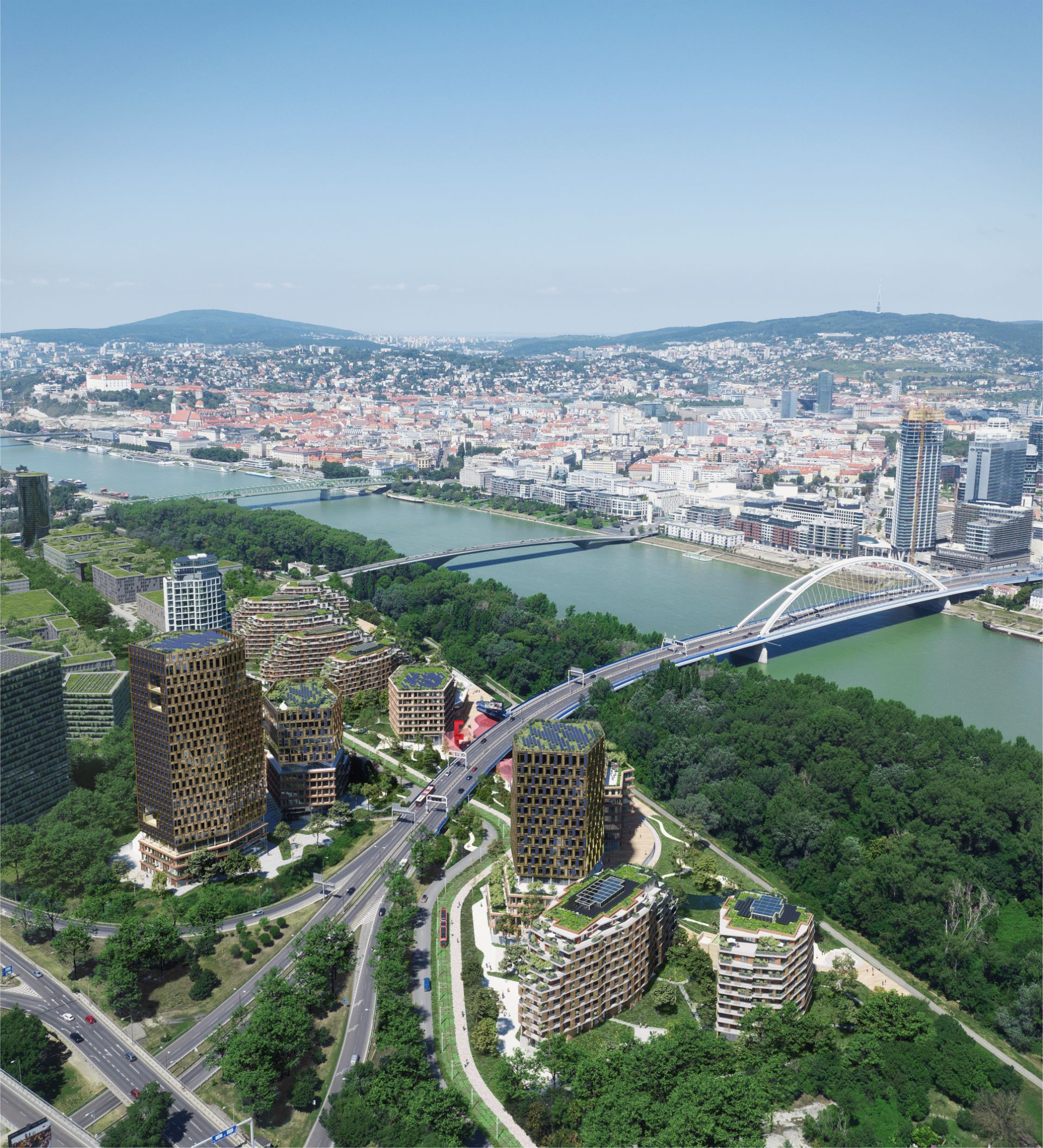 "Autá teda vchádzajú čo najskôr do podzemných garáží, vnútorné územie a nábrežná zóna budú upokojené. Posilní sa úloha mestskej hromadnej dopravy, pešieho pohybu a cyklodopravy, ktorá nadviaže na existujúce trasy, ako sú Eurovelo 6 na hrádzi alebo cyklocesta popri Chorvátskom ramene," píše developer v tlačovej správe.